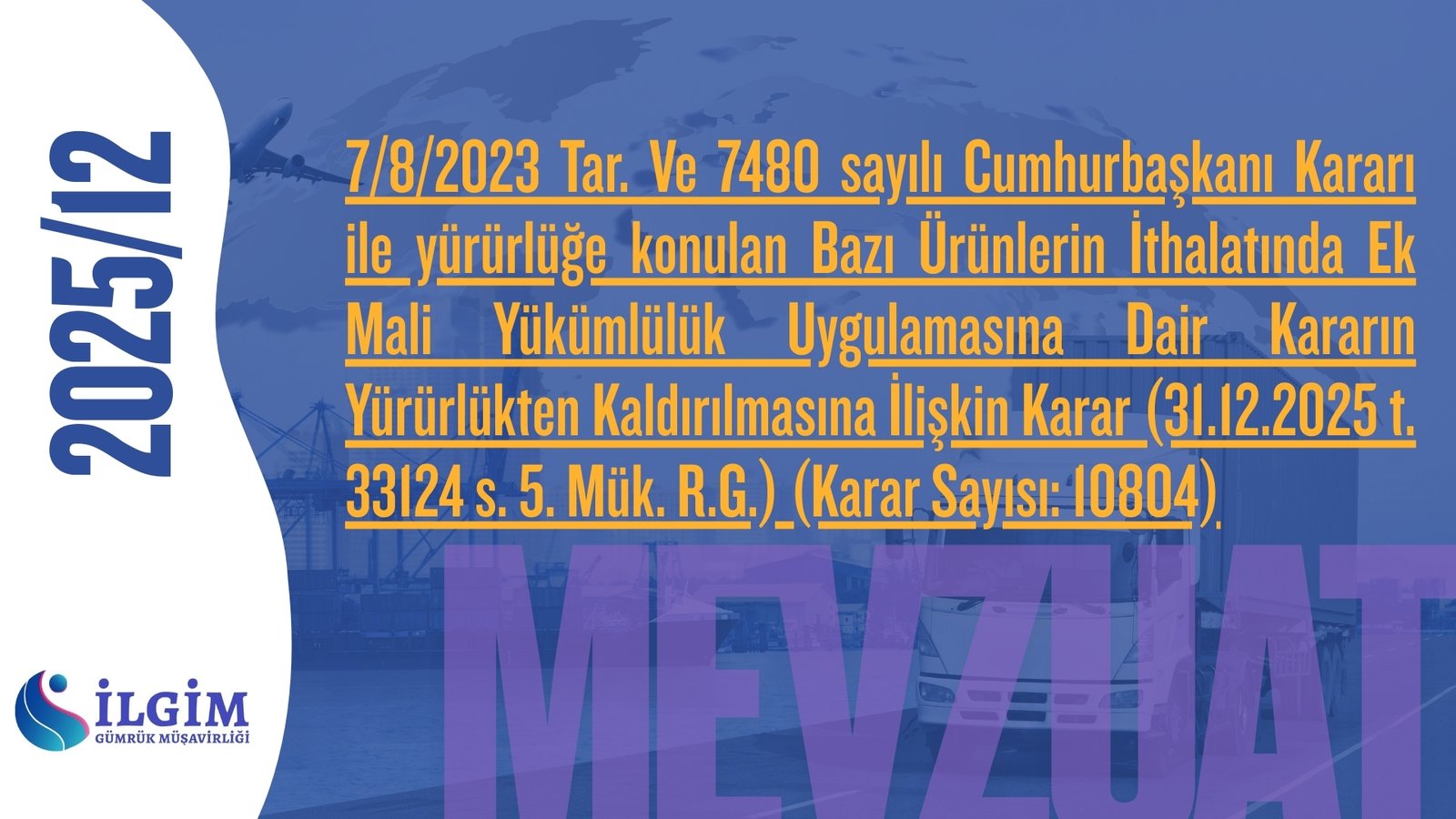 7/8/2023 Tar. Ve 7480 sayılı Cumhurbaşkanı Kararı ile yürürlüğe konulan Bazı Ürünlerin İthalatında Ek Mali Yükümlülük Uygulamasına Dair Kararın Yürürlükten Kaldırılmasına İlişkin Karar (31.12.2025 t. 33124 s. 5. Mük. R.G.) (Karar Sayısı: 10804)