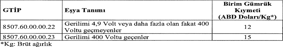 (- Lityum iyonlu akümülatörler:- – Prizmatik olanlar: – – – Lityum demir fosfat (LFP) tabanlı olanlar: ) ticari tanımlı eşyaların ithalatında gözetim uygulaması getirildi. (Yürürlük: 30/01/2026)